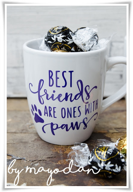 Im Bastelhandel habe ich mir einfache weiße Porzellantassen bestellt und diese mit Schriftzügen, die mein Plotter für mich ausgeschnitten hat, verschönert.